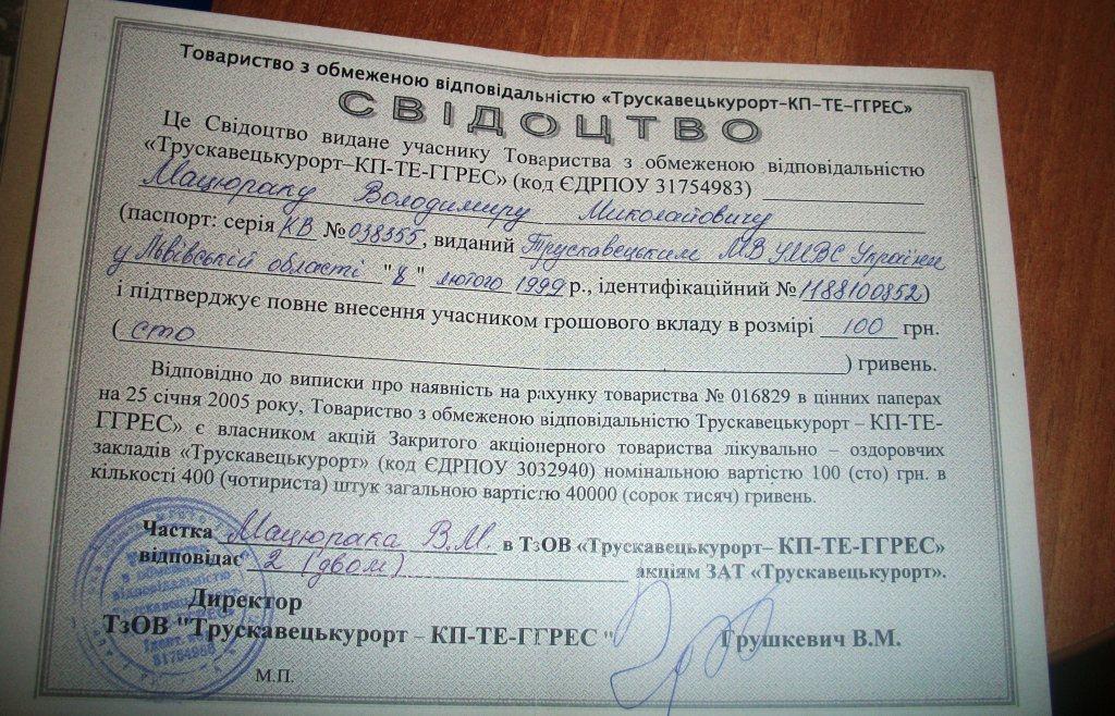 Водночас порушено ст.2 п.1. Закону України «Про власність» №885-Х11, від 26 березня 1991 року, в якій сказано: «Право власності-це врегульовані законом суспільні відносини щодо володіння, користування і розпорядження майном» та проігноровано постанову верховної Ради України «Про порядок тимчасової дії на території України окремих актів законодавства союзу РСР». В другому абзаці якої пише: «Встановити, що до прийняття відповідних актів Законодавства України на території республіки застосовуються акти законодавства союзу РСР, з питань, які не були врегульовані законодавством України». Тобто, саме утворення в той час акціонерного товариства не маючи майна установ (наприклад санаторіїв міста Трускавця), було нікчемним. При глибшому вивченні цієї афери на кожному кроці можна знайти ряд підтверджуючих документів, які говорять про нікчемність утворення АТ… (аналіз сторінки 66-72). Українського законодавства про акціонерні товариства на той час не існувало. Окрім того зареєстрована ця організація була Трускавецькою міською державною адміністрацією (що була у незаконний спосіб утворена та документи про скасування архівом не були надані) (див. сторінки №11) рішення про доадотк.1 додаток 2