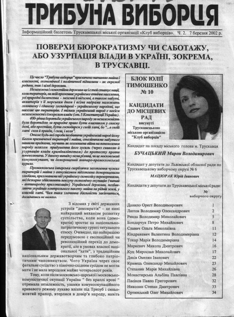 Окрім Святослава Грабовського про злочинні схеми в справі приватизації майна у Трускавці говорив і громадський діяч, Почесний громадянин міста Трускавця, депутат Львівської обласної ради першого демократичного скликання Мирон Бучацький. Понад два десятки років він піднімає це питання, говорить про нього де лиш може, б`є у всі дзвони. Детальне розвінчування схем, які, на думку Мирона Бучацького, є шахрайськими, злодійськими та протизаконними, описано в кількох номерах бюлетеня «Трибуна виборця», редактором якого є Мирон Володимирович.