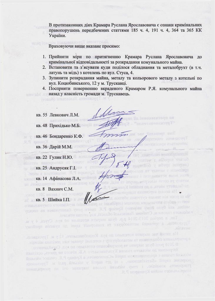 Але я збираюся звернутися в органи внутрішніх справ, зокрема в поліцію. Хоча в газеті цього немає, але на сайті «Джерел Трускавця» було розміщено звернення десяти мешканців Трускавця на предмет того, що керівник підприємства розікрав метал і так далі. В мене була перевірка з поліції за скаргою цих десяти мешканців. Поліція опитала всіх. З цих десяти троє перебуває за кордоном на заробітках. Тобто, вони фізично не мали можливості підписати цю заяву. А решта дали письмове пояснення, що вони таких нісенітниць не писали і не підписували. І ці люди дали зразки своїх підписів.