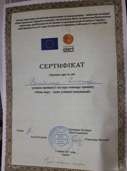 Проект «Сіємо зерна миру для урожаю порозуміння та взаємодовіри» реалізує відома в нашому краї Асоціація «Нові Горизонти» (Президент Олександр Магльона). Фінансує його Європейський Союз через Інструмент зі сприяння стабільності і миру (ІССМ). В рамках реалізації цього проекту 9 червня у мальовничому селі Жданівка на Дрогобиччині в садибі «Родинне гніздо» проходив семінар-тренінг «Мова миру – шлях успішної комунікації», участь в якому взяли представники міських та регіональних ЗМІ, громадських організацій, депутати, громадські діячі тощо.