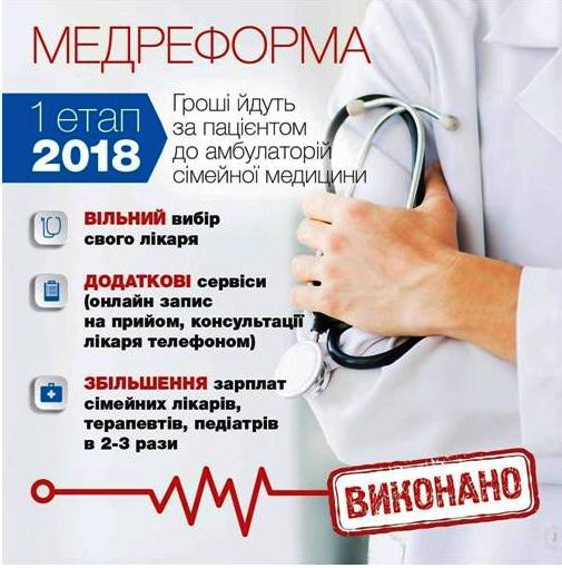 Медреформа стартувала з первинної ланки меддопомоги, яку надають сімейні лікарі, терапевти, педіатри. Кожна людина отримала можливість вільно обрати свого лікаря, якому довіряє, незалежно від свого місця проживання чи прописки, та підписати з ним декларацію на обслуговування. Відповідно бюджетні гроші почали надходити до того медзакладу, де працює лікар, якого обрала людина.