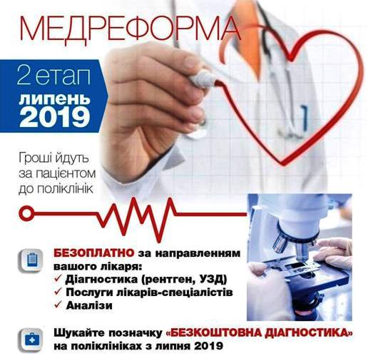 З липня 2019 року бюджетні гроші підуть за пацієнтом на вторинний рівень меддопомоги – до поліклінік, де кожна людина зможе пройти безкоштовно обстеження, здати аналізи, отримати консультацію лікаря-спеціаліста. Єдина умова для безоплатного отримання цих послуг – мати направлення свого лікаря.