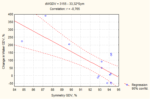 Залежність змін світіння води (вісь Y) від початкового стану симетрії газорозрядного зображення оператора (вісь Х)