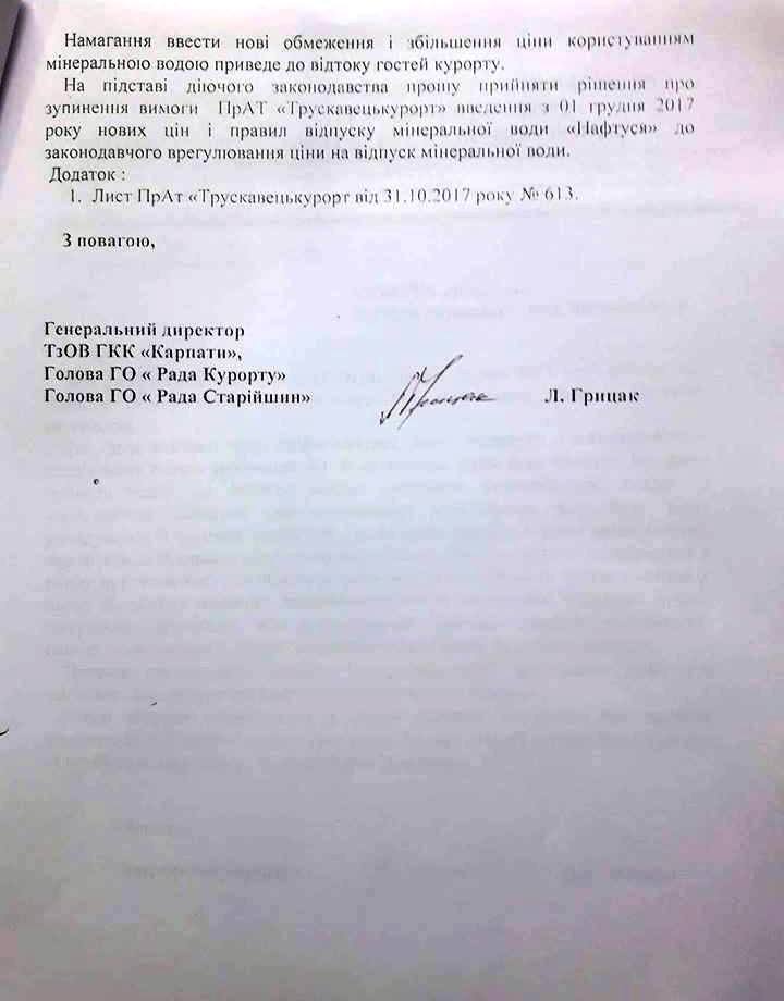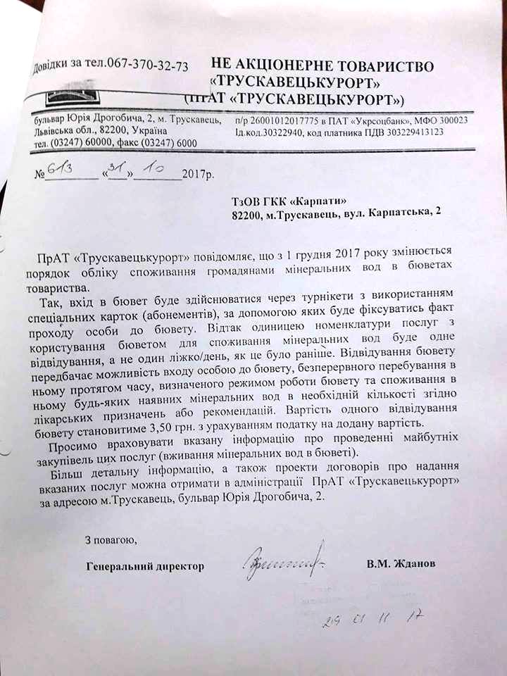 08.12.2017 р. адміністративна комісія Львівського обласного територіального відділення Антимонопольного комітету України оштрафувала ПрАТ «Трускавецькурорт» на 68 тис. грн. за порушення законодавства про захист економічної конкуренції, у вигляді зловживання монопольним (домінуючим) становищем на ринку забезпечення гідромінеральною сировиною Трускавецького родовища в бюветах №1, 2. Цьому рішенню передувало звернення, фотокопія якого наводиться нижче.