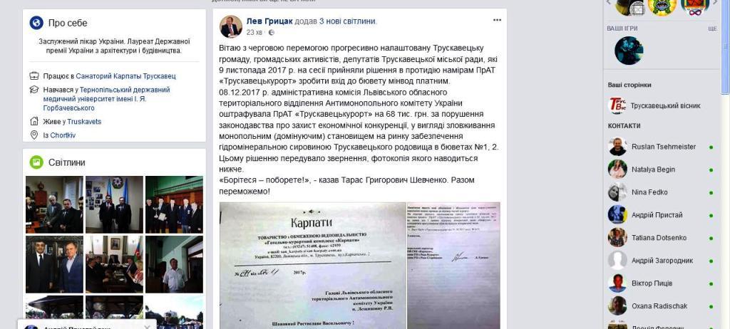 Генеральний директор ГКК «Карпати», голова МГО «Рада Старійшин» м. Трускавця Лев Грицак висловив задоволення з того приводу, що Антимонопольний комітет України відреагував на його звернення щодо зловживання ПрАТ «Трускавецькурорт» монопольним становищем і наклав штраф на цю структуру. Про це він повідомив у своєму пості на Фейсбуці.