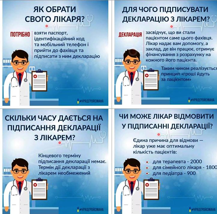 В рамках медичної реформи з 2 квітня в Україні стартувала кампанія з обрання лікаря. Люди вибирають лікарів, яким довіряють, та підписують з ними декларації на обслуговування. З липня медичні заклади почнуть переходити на нову систему фінансування – держава платитиме саме тим лікарям та медзакладам, до яких звертаються люди за допомогою.
