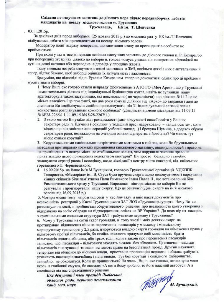 4. 16.09.2015 р. на Ваше ім’я М. Бучацьким, головою Трускавецької організації УДКППБ Товариства. «Меморіал» ім. В. Стуса була вручена скарга щодо недопустимості паркування кінних екіпажів біля пам’ятника Папи Римського Івана Павла II, що встановлений біля римо-католицького храму у Трускавці. Впродовж півтора місяця до виборів Ви не реагували і проігнорували нашу скаргу. Що це означає? (Див. скаргу на ім’я міського голови від 16.09.2015 р.)