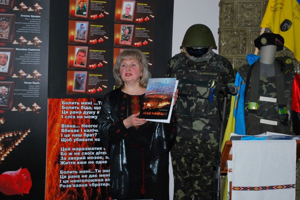 У вівторок, 21 лютого, в історичному відділі музею «Дрогобиччина» відбулася презентація книги Лілі Кобільник «Небо Майдану», присвячена Героям Небесної Сотні. Досить великий зал, в якому представлені світлини, цінні експонати з київського Майдану, особисті речі наших земляків, які загинули на Інститутській, не міг вмістити всіх бажаючих почути поетичне слово покладене на музику відомої виконавиці, барда, викладача Дрогобицького державного педагогічного університету ім. І. Франка Лілі Кобільник. Поминальну молитву за загиблими Героями Небесної Сотні та воїнів АТО відправив отець Ігор Цмоканич, та висловив надію, що ця книга стане камертоном, який переросте в дзвін та налаштує нас на хвилю змін.