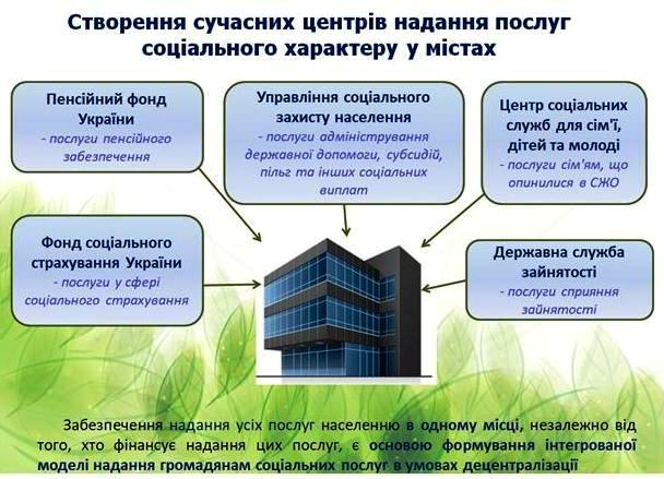 Урядова реформа децентралізації вирішує цю проблему: 665 утворених територіальних громад (ОТГ) вже взяли на себе нові повноваження, у тому числі з питань соціальної політики. Зараз уряд допомагає ОТГ створювати сучасні центри надання соціальних послуг у форматі «Прозорий офіс». У минулому році з державного бюджету було виділено 52,4 млн грн. місцевим бюджетам міст Кам’янське, Київ, Львів, Одеса та Харків на створення таких центрів. Цього року бюджетні кошти на ці цілі отримають 8 міст обласного значення (Бахмут, Дружківка, Кам’янське, Кропивницький, Мирноград, Новоград-Волинський, Рубіжне, Чернігів) та 8 об’єднаних територіальних громада (Мереф’янській міській, Радивилівський міській, Гніздичівській селищній, Мельниця-Подільській селищній, Скала-Подільській селищній, Байківецькій сільській, Великодедеркальській сільській, Студенянській сільській). Загальна сума бюджетної підтримки сягне 142,7 млн грн.
