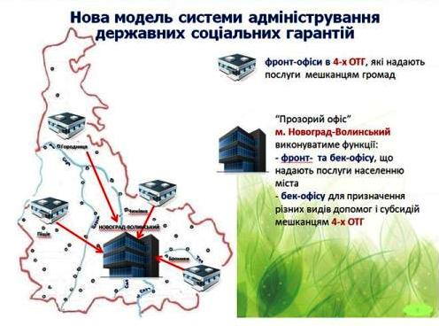 У новій моделі центр надання адміністративних послуг міста здійснюватиме нарахування та виплату усіх видів програм також і для мешканців 4-х об’єднаних територіальних громадах, що створені у цьому районі. При цьому у всіх громадах будуть власні фронт офіси. На будівництво нового офісу у Новоград-Волинському з держбюджету вділено 8 млн грн., ще 5 млн грн. витратить місцевий бюджет. Будівництво планується завершити до кінця року.