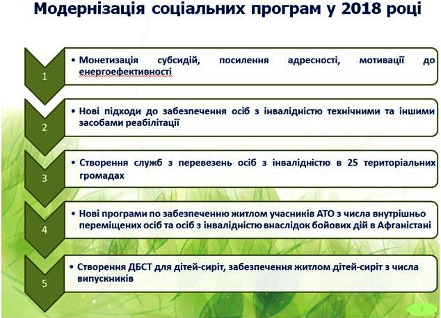 30 програм Мінсоцполітики зараз передано на місця і функціонують за принципом «гроші ходять за людиною». Зокрема, У цьому році було змінено підходи до забезпечення осіб з інвалідністю технічними та іншими засобами реабілітації та надання житлових субсидій. Ці зміни створили передумови для запровадження повної монетизації програми субсидій у 2019 році. Головне ж, що такий принцип посилює соціальний захист людей, що потребують державної допомоги і гарантує, що таку допомогу отримають всі.