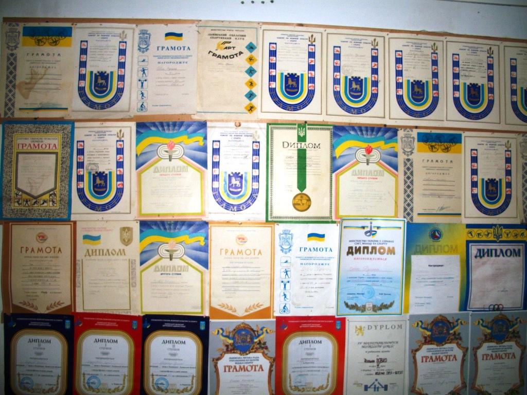 – Зараз, на даний момент, займається 35. 17 з них – це учні (від п’ятого класу і вище), в тому числі і дівчата. З тих старших, тобто дорослих, що займаються – і воїни АТО, зокрема й Василь Тимчишак, який недавно знову поїхав воювати на Схід. Ось біля мене стоять мій син Руслан, триразовий чемпіон України з пауерліфтингу, та Василь Шимко – теж достатньо відомий спортсмен, його прізвище часто згадується в газетних публікаціях. Мої вихованці постійно беруть участь не тільки в чемпіонаті України, але й їздять за кордон, ось, для прикладу, зовсім недавно побували в Угорщині на чемпіонаті з пауерліфтингу. Та що буду багато говорити про результати – про них красномовніше скажуть ось ці всі нагороди, грамоти, кубки, медалі, які Ви бачите…