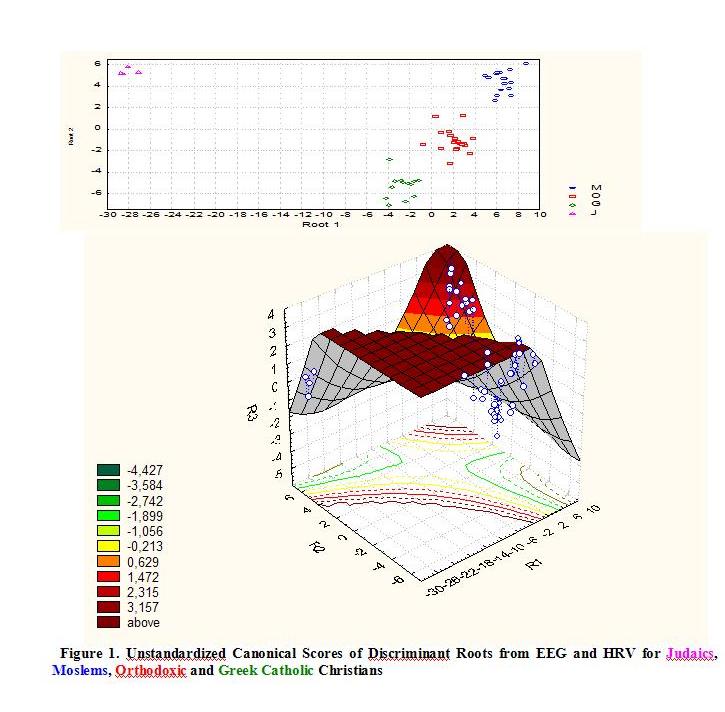 Чергове сенсаційне відкриття зробили трускавецькі учені на чолі з Ігорем Поповичем. З літератури відомо, що методами нейровізуалізації (комп’ютерної томографії) виявлено, що у осіб, котрі практикують медитацію та у католицьких монахинь суттєво змінені розміри і метаболічна активність окремих структур головного мозку, при цьому характер змін неоднозначний. Це навіяло Поповичу І.Л. гіпотезу, що між представниками різних релігійних конфесій можливі відмінності і за параметрами біоелектричної активності мозку. Для перевірки гіпотези склалися сприятливі обставини, адже гостями курорту є, поряд з християнами, також мусульмани та іудеї. Застосувавши апаратно-програмні комплекси “НейроКом” і „КардіоЛаб+ВСР” (оператор – науковий співробітник Тетяна Королишин), у 30 чоловіків (13 православних, 7 греко-католиків, 8 мусульман і 2 іудеїв), котрі лікувалися на курорті Трускавець від хронічного пієлонефриту в фазі ремісії, вони зареєстрували 54 електроенцефалограми і кардіоінтервалограми (у 23 до і після бальнеотерапії). Отримані дані були оброблені на комп’ютері за спеціальною програмою, яка дає можливість виявити саме ті показники, за сукупністю яких представники різних конфесій чітко розмежовуються. підсумки унаочнено на рисунку.