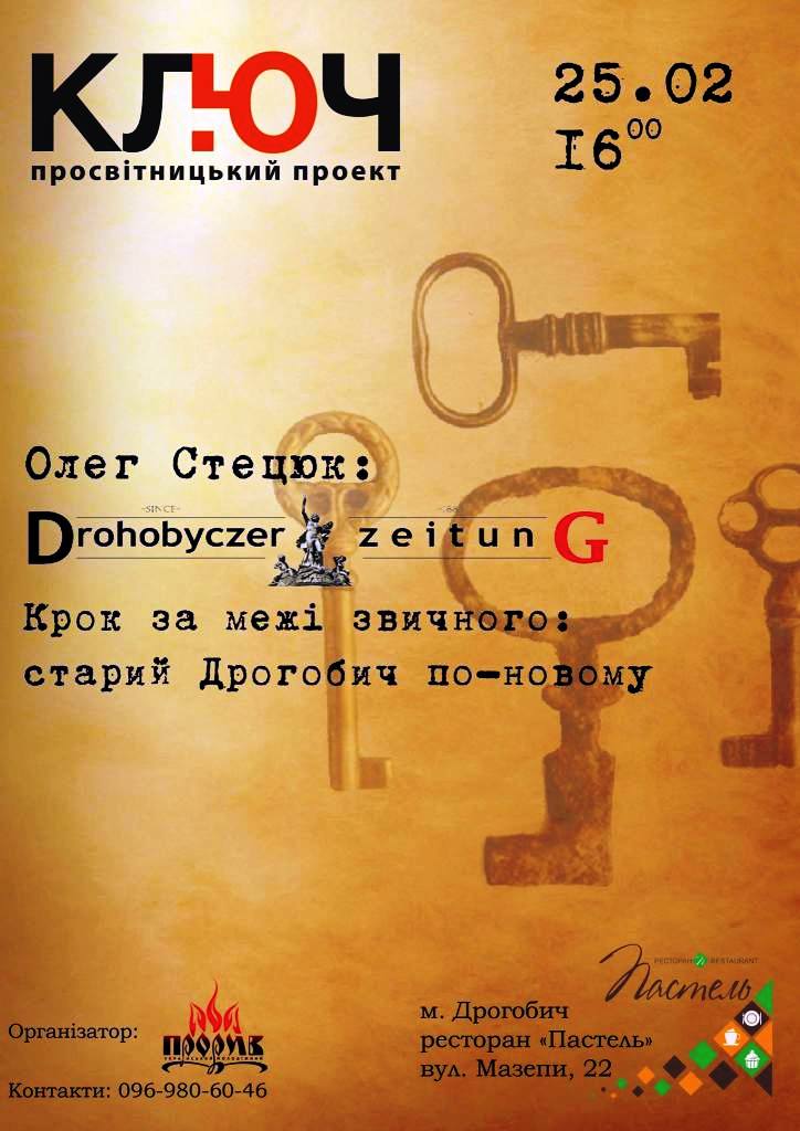 «Треба вміти виділятися з натовпу. А що робиш для цього ти? Будь інакшим! Незвичність притягує. Знайди натхнення у минулому. Запрошуємо! Відкриваємо вартісне!». Так інтригуюче запрошували на зустріч з Олегом Стецюком, молодим дрогобицьким істориком та журналістом, представники Просвітницького проекту «Ключ». І зустріч, яка проходила 25 лютого в дрогобицькому ресторані «Пастель», дійсно відкрила вартісне – те, що старе, і те, що нове. Але про все по порядку.