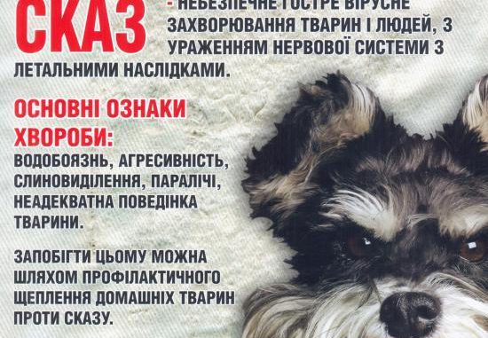 – для захисту від сказу необхідно правильно утримувати домашніх тварин. Сторожових собак – в установах, підприємствах та організаціях тримати на ланцюгах, в спеціально відведеному для цього місці. Щорічно проводити їм щеплення проти сказу, виводити на вулицю в намордниках. Забороняється вигулювати собак на територіях лікувально-профілактичних закладів, шкіл, дитячих навчальних закладів, закладів інтернатного типу, в парках та скверах, приводити їх з собою на ринки, в магазини та нацьковувати на людей.