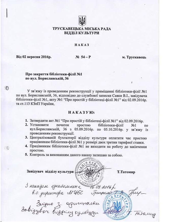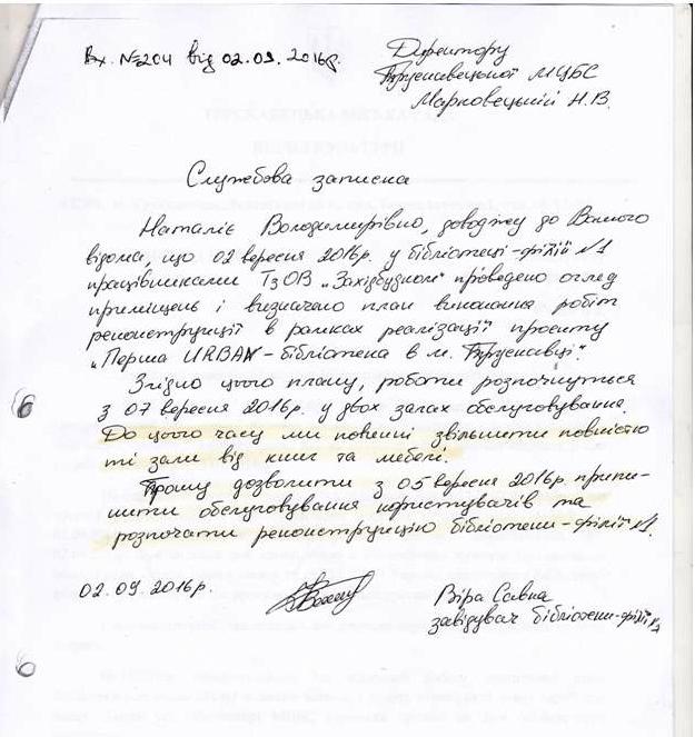 Тож 2 вересня 2016 р. в п’ятницю (п’ятниця в нашій бібліотеці це завжди вихідний день) мені в другій половині дня зателефонували представники генпідрядника, які повинні були виконувати ремонтні роботи в приміщенні бібліотеки. Вони повідомили про намір оглянути того ж дня приміщення бібліотеки та попросили прийти відкрити бібліотеку. До вечора 2 вересня 2016 року ми з представниками генпідрядника оглядали приміщення бібліотеки, радились та обговорювали етапи і почерговість майбутнього ремонту. Про цю зустріч я написала службову записку на ім’я директора Трускавецької МЦБС Марковецької Н.В., в якій повідомила про заплановане проведення ремонтних робіт та просила надати дозвіл на їх виконання і на тимчасове припинення обслуговування читачів бібліотеки з 5 вересня 2016 року для того, щоб була можливість звільнити зали обслуговування від книг та меблів. Адже всі приміщення бібліотеки були заставлені стелажами з книгами та іншими меблями. Нічого надзвичайного, адже у повноваженнях директора бібліотек міста є видавати подібні накази у зв’язку з проведенням внутрішніх робіт у бібліотеці, наприклад, при перевірці фонду раз на п’ять років у бібліотеці до двох тижнів припиняється обслуговування читачів. А тут перший раз за сорок років реконструкція всієї бібліотеки…