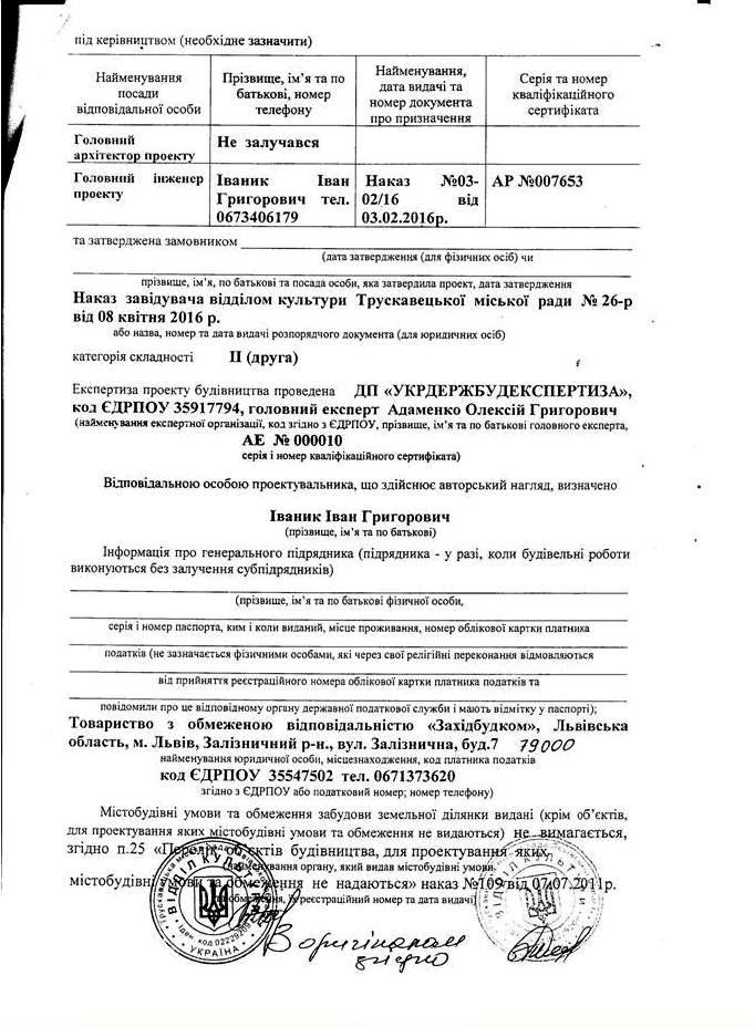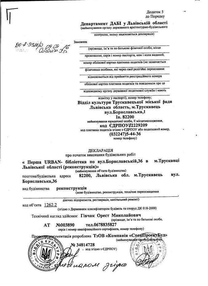 Але виникла ще одна важлива перепона. Виявилось, що до цього часу від квітня 2016 р., відділом культури не виготовлено Декларацію про початок виконання будівельних робіт по проекту «Перша URBAN бібліотека по вул. Бориславській, 36 в м. Трускавці Львівської області (реконструкція)». Зверніть увагу, сторінка 2-га Декларації, що Наказ завідувача відділу культури Трускавецької міської ради за №26-р був написаний ще 8 квітня 2016 р. і за пів року п. Татомир не знайшла часу виготовити цей дозвільний документ, чи може взагалі не хотіла, всіляко затягуючи час із документацією.