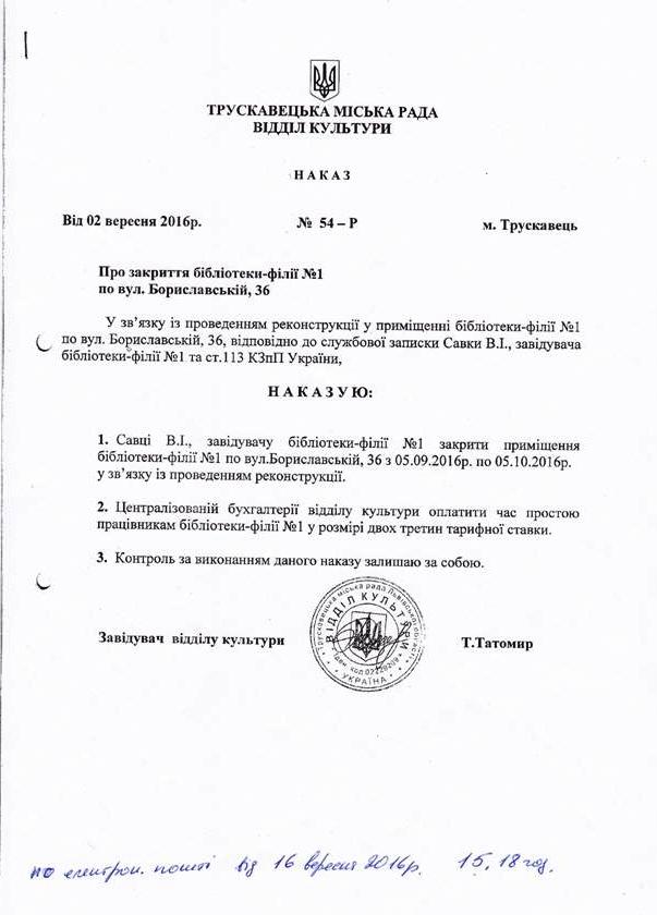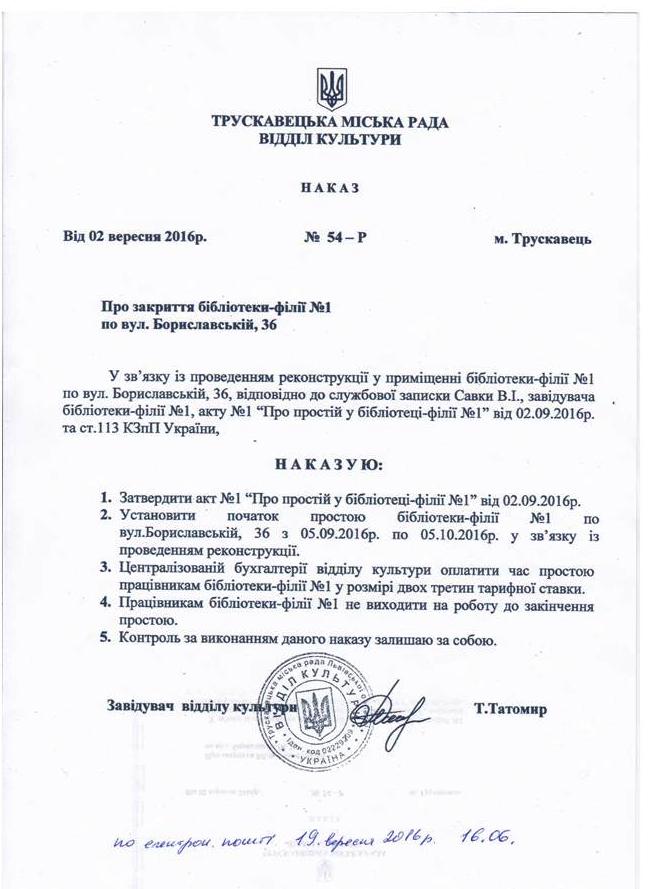 А я зранку, 19 вересня, у понеділок, знову поїхала до Львова забирати ті дозвільні документи. І саме тоді, будучи в дорозі, мені подзвонила Галина Грицило, яка на той час виконувала обов’язки директора МЦБС, бо Марковецька Н.В. з 13.09.2016 по 26.09.2016 р. знаходилась у відпустці, і вперше мене повідомила телефоном, що на електронну пошту прийшов Наказ № 54-р від 02.09.2016р.