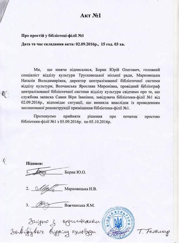 Тобто, якщо вірити, що цей акт був складений саме 02.09.2016 р., у п’ятницю, у звичайний вихідний день бібліотеки, то виходить так, що троє посадовців Борик Ю.О., Марковецька Н. В. та Волчанська Я.М. з якогось дива, не повідомивши мене, пішли до бібліотеки «цілувати клямку»? Зверніть увагу, вже в акті 02 вересня вони посилаються на мою службову записку, яку я, в ту годину, ще навіть не писала, і яку Марковецька Н.В. забере лишень на наступний день, у суботу. Дуже цікаво у відділі культури Трускавецької міської ради переміщаються документи у просторі і часі.