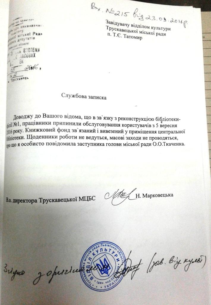Службова записка п. Марковецької датована саме того числа, коли я звернулася до міського голови з листом щодо ситуації з Наказами 54-р від 02.09.2016 р.