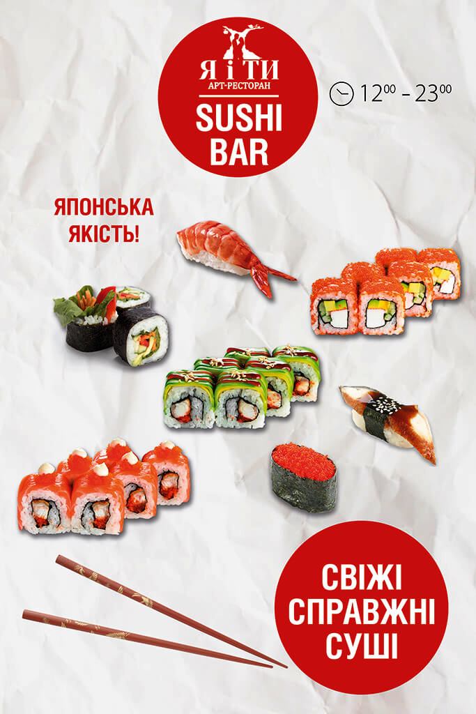 Суші-бар «Я і Ти» відкрився на початку травня 2016 року. Тут шанувальники ролів та страв японської кухні можуть повною мірою насолодитися їхнім смаком. Меню можна переглянути на офіційному сайті ресторану http://яіти.укр/menu-2/ Замовляйте столик за тел. +38 (03247) 5-34-64, +38 (096) 151-17-90, +38 (093) 47-26-871.