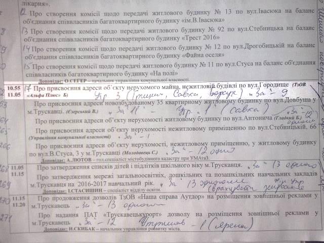 Не підтримали цього рішення виконкому лише 4-є (Ренат Борсук з КУНу, Віра Савка з Народного контролю та Олександр Грищенко бувший архітектор міста Трускавець, Ярема Олег з Громадянської позиції був відсутній на момент голосування “доповнено 22-09-2016 з його коментаря”) чому інші це підтримали нехай тут напишуть і пояснять виборцям та депутатам чиї інтереси вони відстоюють??