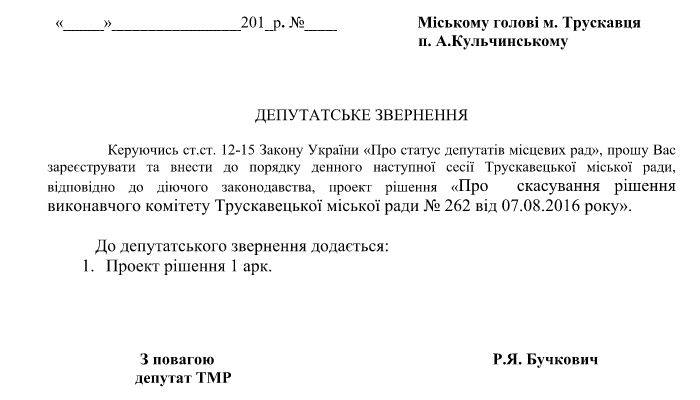 Депутат від КУН Бучкович Роман, підготував проект рішення про скасування рішення виконкому..”