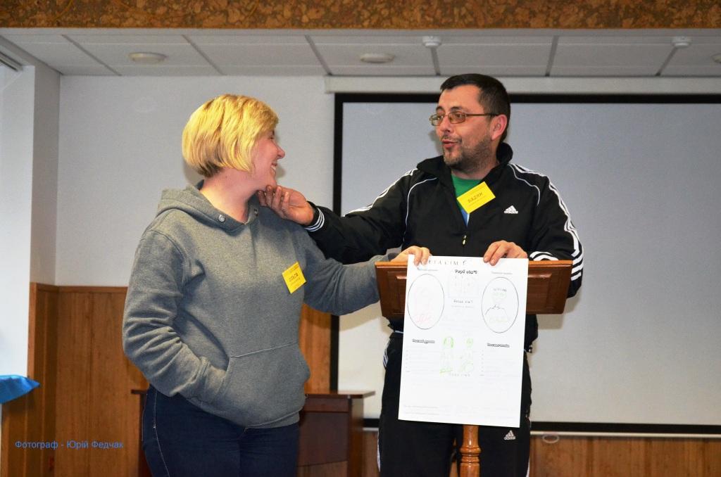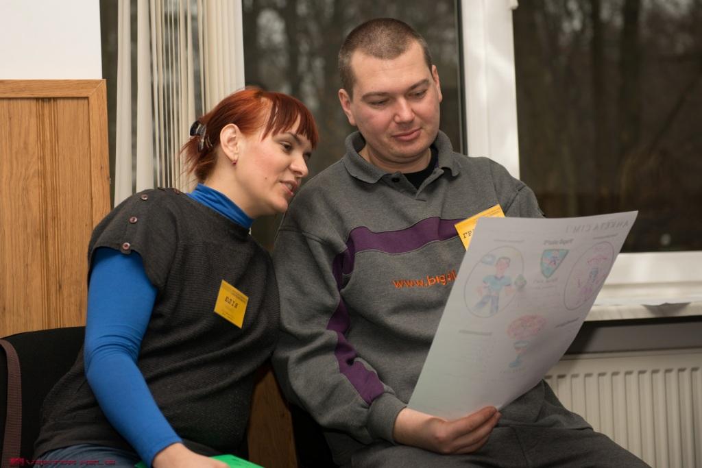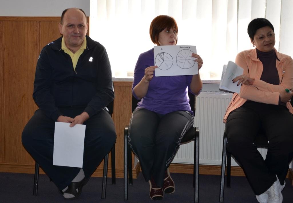 Розставлені акценти торкались, зокрема, стосунків чоловіка і дружини, які дуже часто в нелегкому побуті забувають про ці ролі, тільки-но ставши мамою і татом. І так приємно було спостерігати зворушливі погляди і чути лагідні звертання, бажання притулитися; бачити усмішки і чути вільний сміх..! «Побут з’їдає любов», – говориться у народному прислів’ї. А ускладнений побут з’їдає любов ще швидше. І люди розгублені в своїй ситуації, часто збиті з пантелику коментарями оточення (не завжди доброзичливого); забувають або не знають, що десь можна почерпнути сил, аби йти далі. Отож пошук ресурсів для чоловіка і жінки, сильне «ми» – теза, яка червоним курсивом пронизує весь семінар для подружніх пар. А формат такого ресурсу різний: ділення досвідом в колі, роздумування над загальними особливостями життя сім’ї з неповносправною дитиною, заповнювання напівжартівливих анкет, вправи у парах (чоловік-дружина), психологічні тести («пиріг уваги»), ігри, спільна вечеря, вільне спілкування… і просто можливість побути удвох. Останнього, на жаль, не має кожна сім’я – чи то через відсутність квартирних умов, чи через брак допомоги родичів або ж з інших обставин. Зрештою, зараз, в час тривоги, війни, нестабільності такий ресурс особливо цінний – можна не вмикати три дні телевізор, не чути сумних новин з АТО і зосередитись лише на собі і своєму чоловікові (дружині). А який ресурс для кожної жінки – не «сушити собі голову», чим годувати сім’ю і насолоджуватись пресмачною їжею, яку «тобі подадуть і заберуть посуд – щось з області фантастики»!