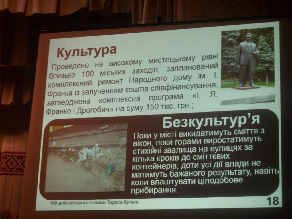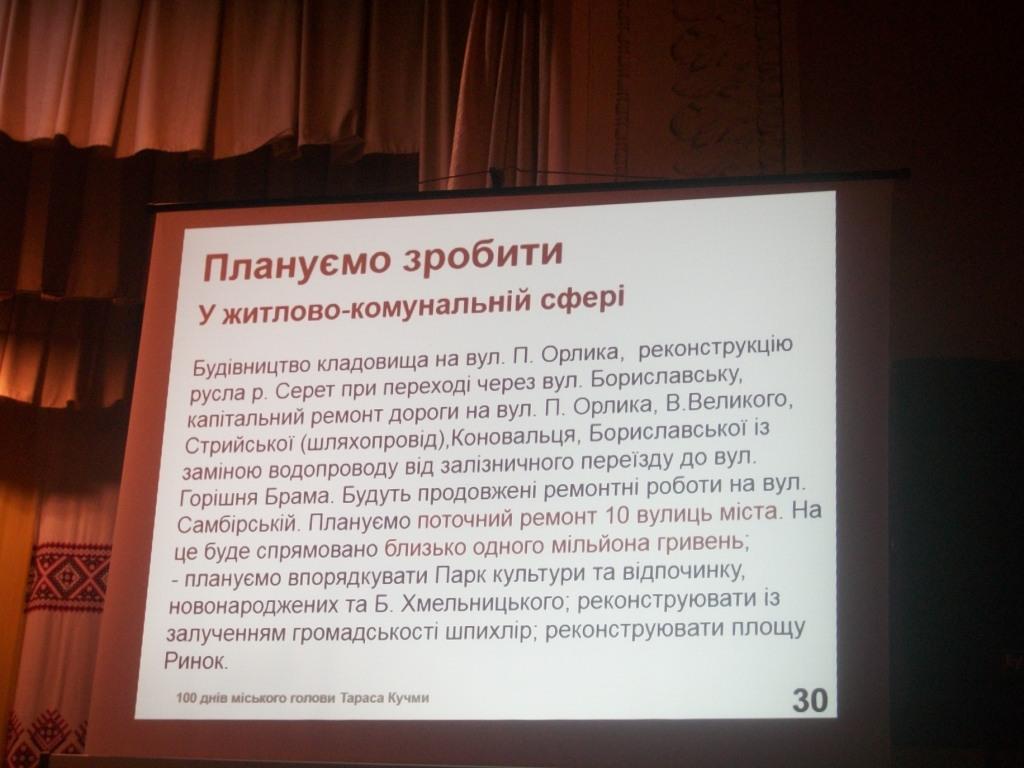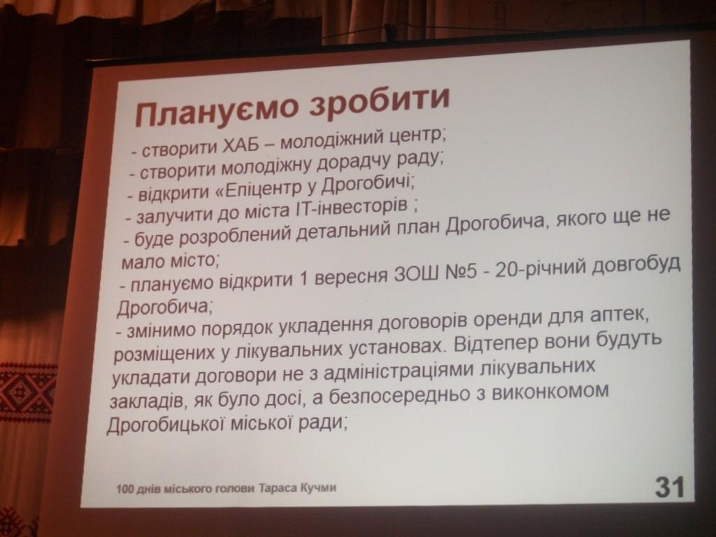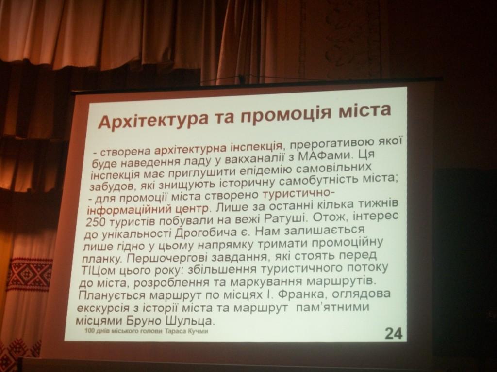 Кожен бажаючий міг взяти почитати друковану версію звіту, опубліковану в газеті «Галицька Зоря». Ці тексти будуть розміщені і на офіційному сайті Дрогобицької міської ради, тому нема потреби повністю переповідати почуте на звіті. Скажемо лише, що чітко та лаконічно Тарас Кучма зупинявся на кожній життєво важливій для дрогобичан сфері – житлово-комунальному господарстві, медицині, освіті, культурі, а особливо на проблемах, які влада не замовчує, а починає вирішувати.