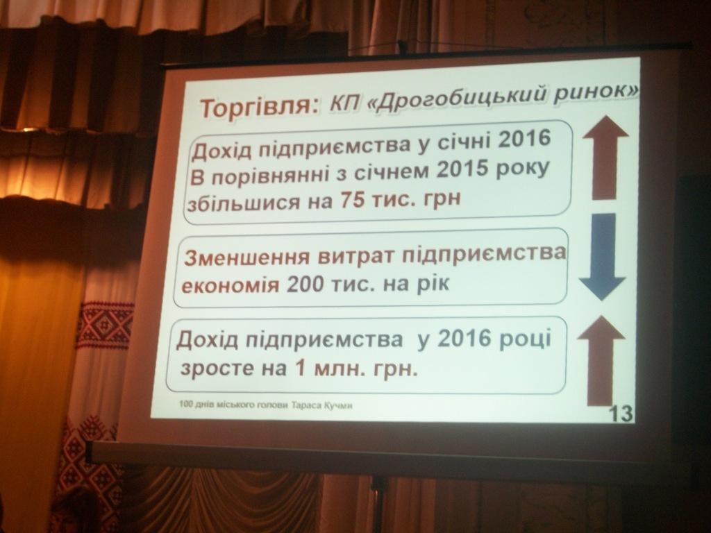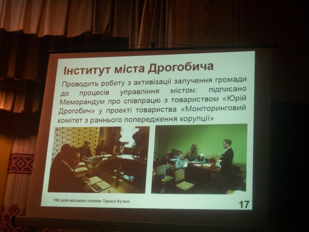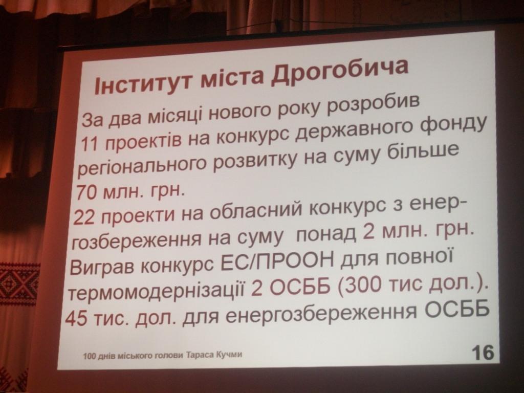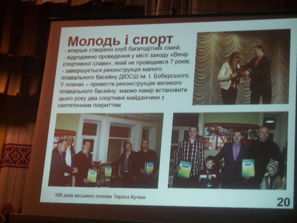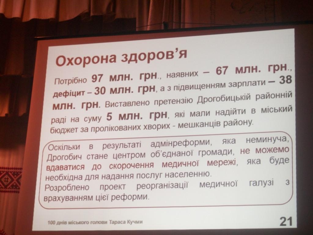Кожен бажаючий міг взяти почитати друковану версію звіту, опубліковану в газеті «Галицька Зоря». Ці тексти будуть розміщені і на офіційному сайті Дрогобицької міської ради, тому нема потреби повністю переповідати почуте на звіті. Скажемо лише, що чітко та лаконічно Тарас Кучма зупинявся на кожній життєво важливій для дрогобичан сфері – житлово-комунальному господарстві, медицині, освіті, культурі, а особливо на проблемах, які влада не замовчує, а починає вирішувати.