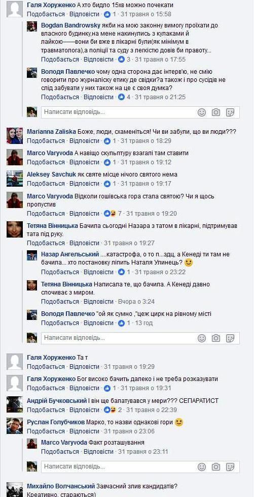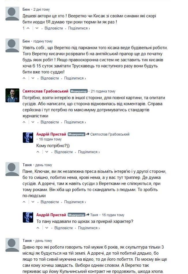 Каміння полетіли у сторону журналістів, які просто виконали свою роботу та записали пряму мову потерпілого та його сина, а також … у сторону міського голови. Мовляв, вигідно Кульчинському, щоб рейтинги Кісака падали. Але ж виборець Кульчинського – це виборець влади, а виборець Кісака – це виборець опозиції. Той, хто проти Кульчинського, після скандалу з побиттям Ігорем Кісаком 60-літнього корінного трускавчанина, аж ніяк не переметнеться у табір влади, а просто підтримає іншого кандидата. Та й дивними виглядають закиди, що Назар Веретка – з обойми Кульчинського. Не Андрій Богданович призначав його на посаду директора комунального підприємства.