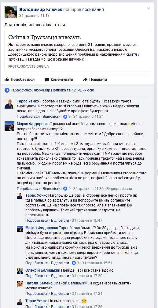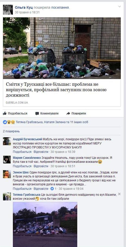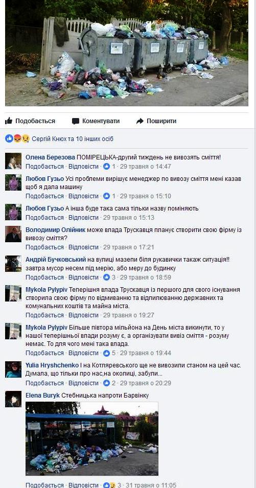Про те, що з вивезенням сміття у Трускавці можуть бути проблеми, влада знала ще в кінці квітня. Тому переповнені сміттєві баки не стали чимось несподіваним, хоча й дратували трускавчан, які востаннє подібну картину бачили десь три-чотири роки тому. Реакція на проблему була різною – відверте зловтішання проплачених журналістів та тролів з команд тих невдах, які програли місцеві вибори 2015 року, повне мовчання міського голови та провладних ЗМІ, намагання справжніх патріотів проаналізувати причини проблеми та не допустити, аби вона якимось чином зашкодила іміджу курорту.