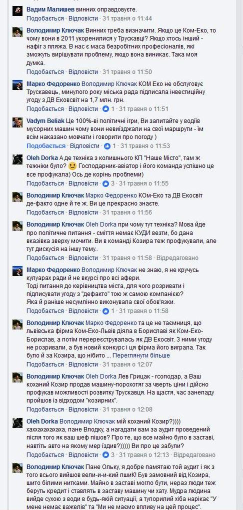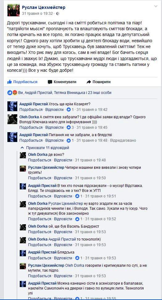 Сміття вивозиться і цю тему вороги курорту скоро перестануть експлуатувати. Але вони розробляють ряд інших – земельну, «Живої Роси», стану дороги на Стебник, електронних декларацій, відбілювання влади «Трускавецького криміналітету» тощо. Все це має на меті зменшити довіру трускавчан до діючої влади, внести розкол у її ряди, дестабілізувати ситуацію де тільки можна і будь-якими способами. Ворог не спить, бо він не лише у Кремлі та Московії. Агенти працюють і їм не пахнуть московські гроші, заплямовані кров`ю наших вбитих хлопців. Негідники тому так і звуться, що гідності та честі в них немає. Шкода, що таких негідників носить і трускавецька земля.