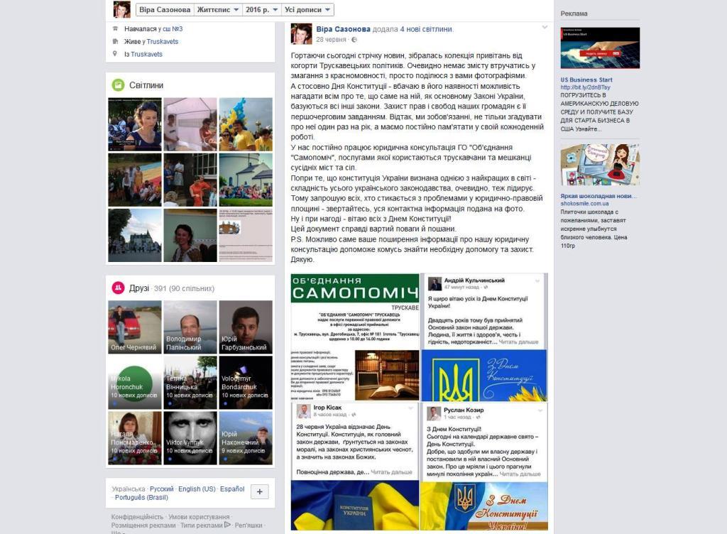Одним із дзвіночків того, що не все гаразд із трускавецькою «Самопоміччю», став як мінімум дивний пост депутатки Трускавецької міської ради від цієї політичної сили Віри Сазонової від 28 червня 2016 р., присвячений Дню Конституції України. Окрім вітання від Об`єднання «Самопоміч» та мера Андрія Кульчинського, депутатка розмістила вітання … Ігоря Кісака та Р. Козира. Як кажуть, випадковостей не буває…