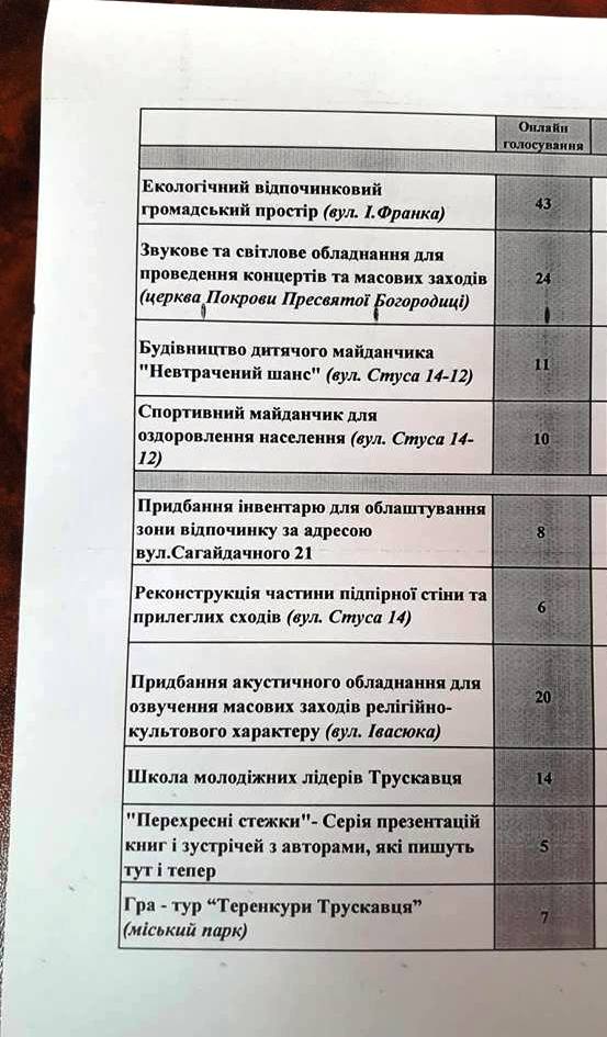 Два тижні – з 30 жовтня по 12 листопада – тривало голосування за проекти, подані у Трускавці на фінансування з міського бюджету. З десяти проектів Бюджету громадських ініціатив (4 великі і 6 малих) кожен трускавчанин міг обрати не більше одного великого і одного малого. Втім, були й такі, хто голосував тільки за один – великий або малий проект.