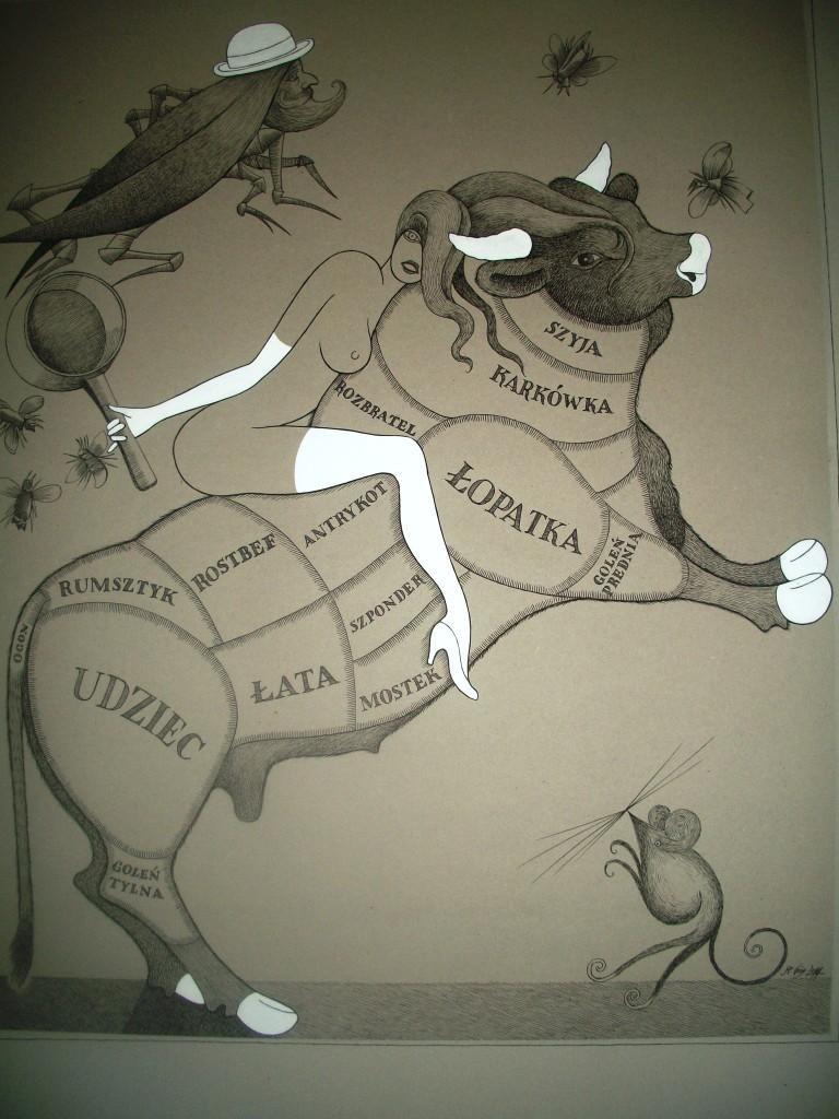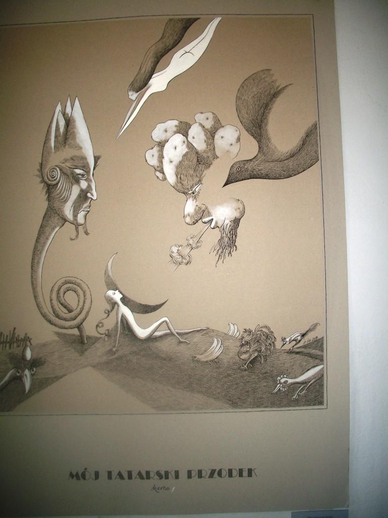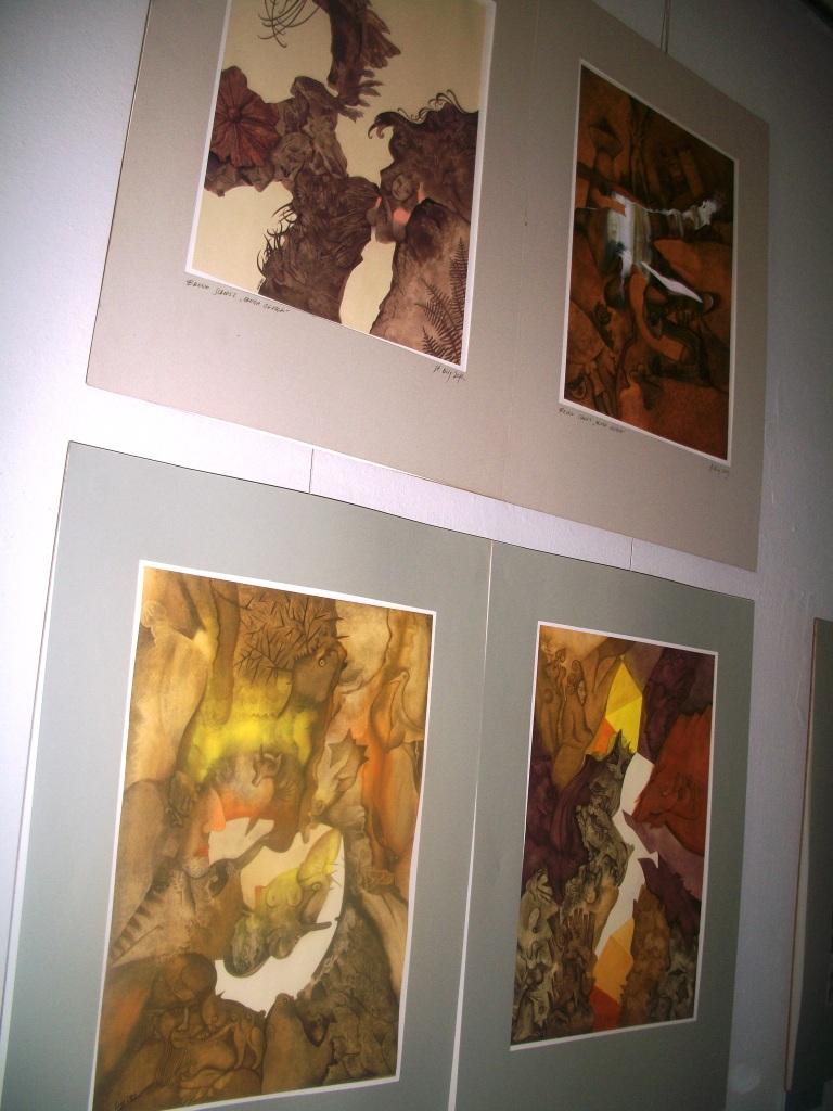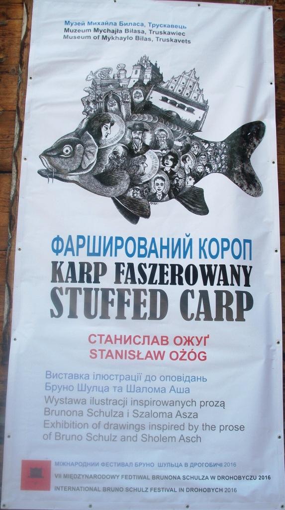 На виставці «Фарширований короп» у Художньому музеї Михайла Біласа представлено хіба частину робіт Станіслава Ожуґа з циклів «Скарб старини», «Чудові тваринки», «Фарширований короп», «Ненаписані казки», інспіровані творчістю Бруно Шульца та Шалома Аша. Крім творів Станіслава Ожуґа експонуються картини дрогобицького митця Лева Микитича. Вашій увазі пропонуємо кілька картин, які передають дух творчості Шульца. А щоб краще зрозуміти цього письменника, рекомендуємо не полінуватися прочитати його твори, які відкривають дивний таємничий світ, витворений проекцією на рідне місто і трансформацією образів та явищ в уяві митця.