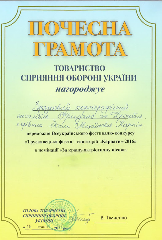 Крім диплому лауреата та почесної грамоти Товариства сприяння обороні України Йосиф Михайлович отримав окрему Подяку як керівник ансамблю «Free dance».