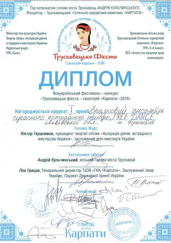 Приємно, що з великим успіхом виступили на Трускавецькому Фестивалі-конкурсі наші юні краяни – ансамбль сучасного естрадного танцю «Free dance» Дрогобицької спеціалізованої школи № 2 (керівник – патріарх танцювального мистецтва на Дрогобиччині Йосиф Карпін). Знаний колектив отримав Першу премію в загальному конкурсі та Ґран-прі в номінації «Кращий патріотичний твір».