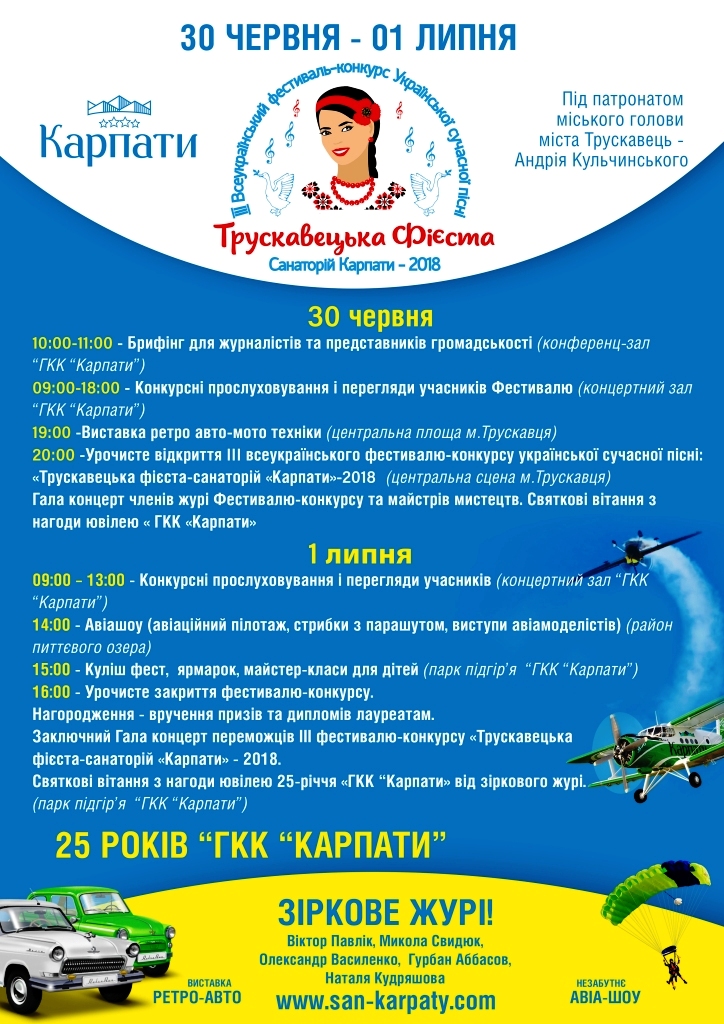 Щорічний Всеукраїнський фестиваль-конкурс сучасної української пісні «Трускавецька Фієста – Санаторій Карпати» традиційно проходить наприкінці травня. В цьому році його перенесено в зв’язку з відзначенням 25-літнього ювілею ГКК «Карпати».