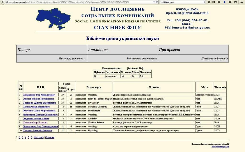 До речі, шосту позицію в рейтингу вчених-медиків за версією Центру досліджень соціальних комунікацій займає колишній заступник головного редактора журналу «Медична гідрологія та реабілітація» професор Олена Радченко, а десяту – почесний редактор цього ж журналу професор Анатолій Гоженко.