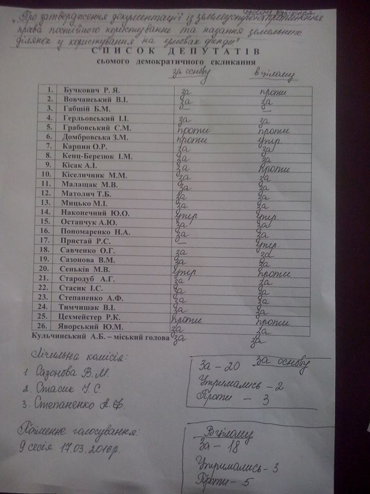 Вчора у Трускавці відбулась сессія міської ради, де одним з питань було надання дозволів на розподіл земель для ЗАТу. Що це значить? Це значить те, що тепер ЗАТ зможе продавати кусками майно та землю у Трускавці. Чим це небезпечно чи недоречно? У Трускавці розпочала свою роботу тимчасова депутатська комісія, щодо перевірки законності приватизації санаторних та інших об’єктів у Трускавці https://www.facebook.com/groups/1772876556278356/ на якій було зафіксовано велику кількість інформації, щодо того, що приватизація відбулась у підозрілий спосіб. Тобто, зараз щось розподіляти чи давати для ЗАТу є передчасним, оскільки може виявитись, що вони продаватимуть те, що їм неналежить. Поки викладаю тут результати голосувань поіменні для аналізу і розповсюдження. А відео та деталі того дня оприлюднимо чуть пізніше.