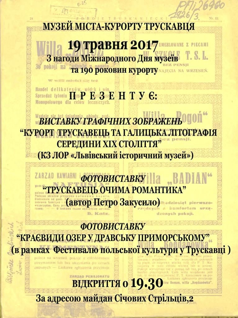 У п’ятницю, 19 травня, в музеї історії міста-курорту Трускавець відбудеться відкриття одночасно трьох фотовиставок. Про це інформує адміністрація музею. Так, до уваги відвідувачів буде представлено виставку графічних зображень «Курорт Трускавець» та галицька літографія сер. ХІХ ст.» від Львівського історичного музею, фотовиставку «Трускавець очима романтика» нашого земляка-фотомитця Петра Закусила та фотовиставку «Краєвиди озер у Дравську Приморському» (в рамках Фестивалю польської культури у Трускавці». Початок заходу – о 19.30.