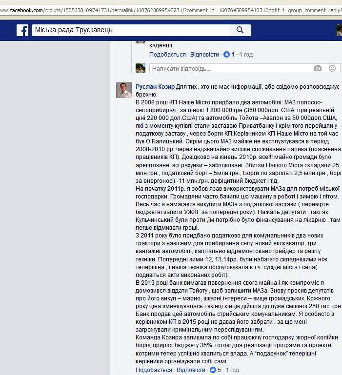 Але через тиждень стало зрозуміло, що куплена за 250 тисяч євро машина, яка є справжньою знахідкою в зимовий період, втрачена остаточно. Біля 200 тисяч гривень (менше 8 тисяч євро за тодішнім курсом) заплатив Стрий і викупив машину: http://protruskavets.org.ua/mashynu-pylosos-povernuty-truskavtsyu-navryad-chy-vdastsya/