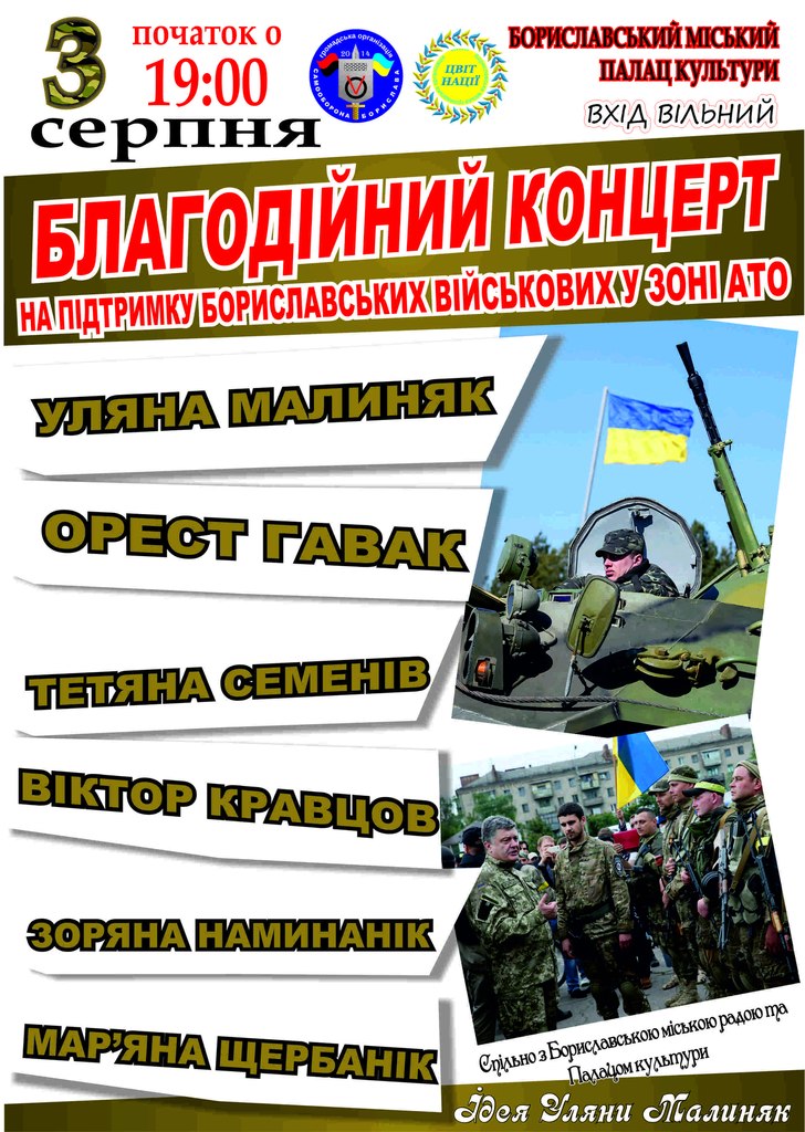 У неділю, 3 серпня, в Палаці культури міста Борислава відбудеться благодійний концерт на підтримку бориславських військових, які беруть участь у бойових діях в зоні Антитерористичної операції на Сході України. В концерті візьмуть участь Уляна Малиняк, Орест Гавак, Тетяна Семенів, Віктор Кравцов, Зоряна Наминанік та Мар`яна Щербанік. Початок концерту о 19.00.