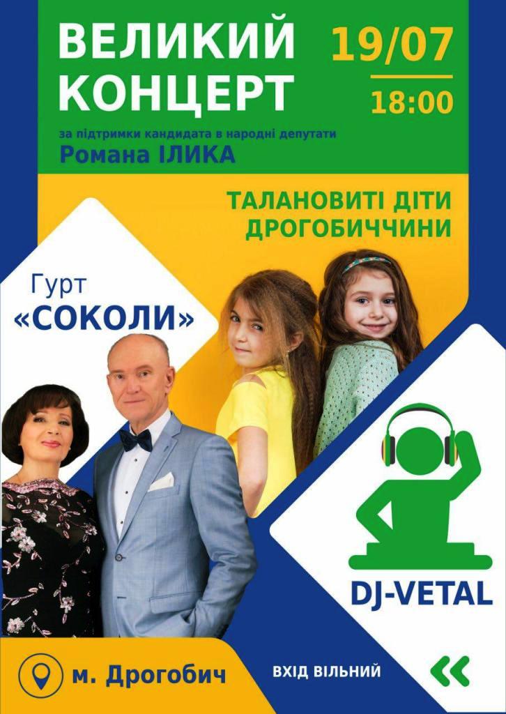 Передвиборчий штаб кандидата у народні депутати Романа Ілика заявляє про спроби завадити провести концерт в рамках ювілейного туру з нагоди 30-річчя гурту «Соколи» у Дрогобичі. Йдеться про захід, в якому також візьмуть участь талановиті діти Дрогобиччини. Концерт запланований на сьогодні, 19 липня, у центрі міста.