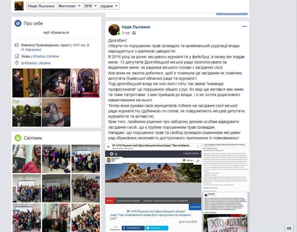 «Дрогобич! Оберти по порушенню прав громадян та кримінальній узурпації влади нарощуються з шаленою швидкістю. В 2016 році за допис місцевого журналіста у Фейсбуці, в якому він згадав мене, 13 депутатів Дрогобицької міської ради проголосували за видалення мене як радника міського голови з засідання сесії. Але вони не змогли добитися, щоб я покинула це засідання як помічник депутата Львівської обласної ради та журналіст.
