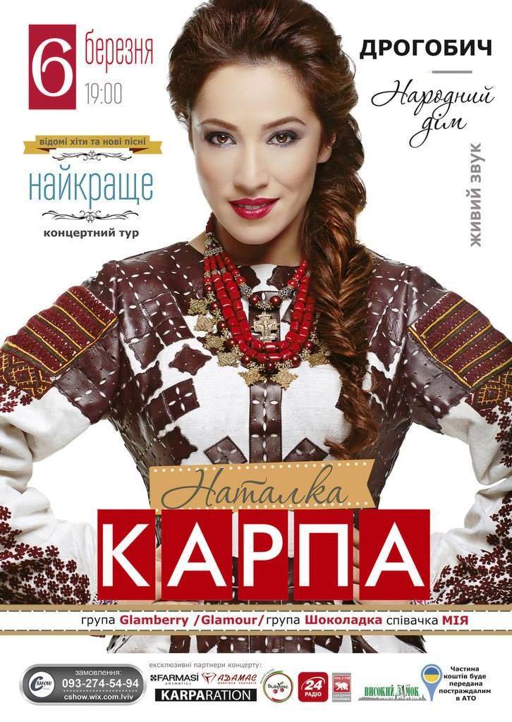Як інформує наше власне джерело, 6 березня о 19.00 в Народному Домі Дрогобича відбудеться сольний концерт співачки Наталки Карпи. Українська співачка, Заслужена артистка України в перші дні весни приїде з теплою, чуттєвою та водночас запальною концертною програмою в Дрогобич. Після туру Латинською Америкою, двох гучних концертів у Львівській Опері, співачка разом зі своєю командою продюсерського центру KARPARATION – музичним бендом, арт-балетом «Gledis», групами «Шоколадка» та Glamberry (ex-Glamour), співачкою Мія їде у весняний тур Західною Україною з програмою «Найкраще» – від таких відомих хітів як «Калина», «Час-пісок», «Інша» до етно-альбому – найновіших танцювальних та ліричних пісень з етно-мотивами. Частина зібраних коштів з продажу квитків буде передана постраждалим в АТО.