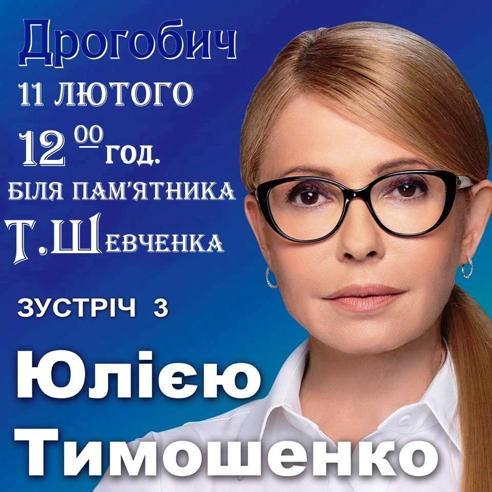 Наступного тижня лідерка партії «Батьківщини» відвідає ряд міст Львівщини, зокрема Дрогобич, Трускавець та Самбір. Як інформує наше власне джерело, на понеділок, 11 лютого, заплановане віче за участю Юлії Володимирівни в Дрогобичі (площа біля пам’ятника Тараса Шевченка). Віче розпочнеться о 12.00.