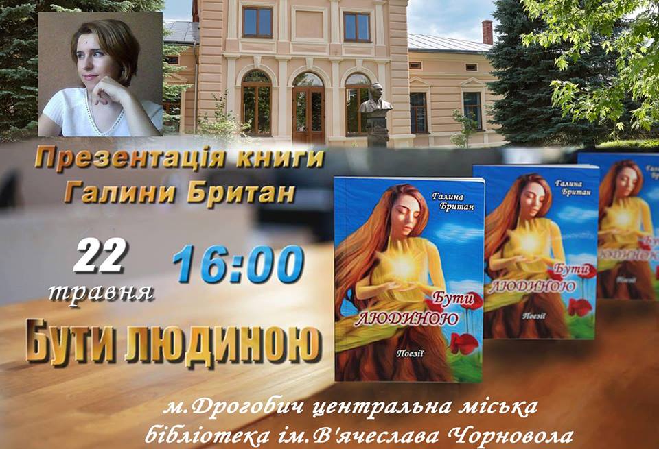 У вівторок, 22 травня, в Дрогобичі в центральній бібліотеці ім. В. Чорновола відбудеться презентація поетичної збірки молодої талановитої поетеси Галини Британ «Бути людиною». «Це красива, глибока, тремтлива і щира поезія», – характеризує вірші молодої поетеси керівник відділу «Тюрма на Стрийській» музею «Дрогобиччина», знана волонтерка Марія Головкевич.