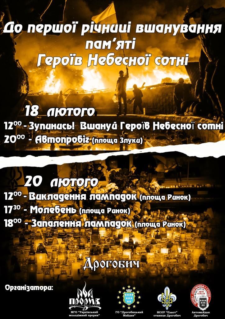 Саме в лютневі дні минулого року на Євромайдані у Києві полягло найбільше Героїв, тих, хто згуртував націю, хто був відважним, безстрашним, прагнув змін, вірив у майбутнє, хто назавжди залишиться в наших серцях, хто поклав своє життя на вівтар свободи і справедливості задля кращого життя наступних поколінь. Відтак активісти Дрогобича запрошують усіх долучитися до вшанування пам’яті Героїв Небесної Сотні.